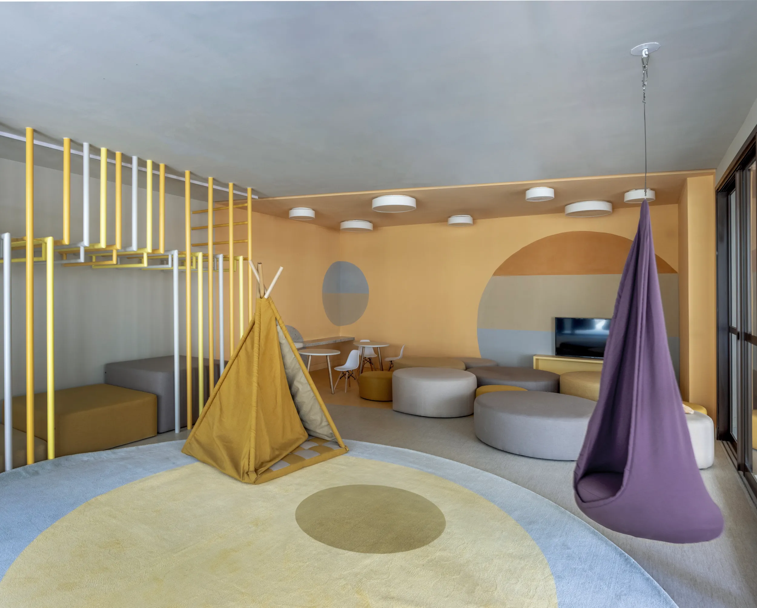 Nos espaços destinados à celebração, como os salões para festas e jogos e o gourmet, imperam os matizes do vermelho, com tons terrosos que remetem à pulsação e efervescência desses momentos de encontro. Ainda sobre as cores quentes, nos ambientes destinados às crianças, os tons de amarelo se fazem presentes, com o intuito de evocar o entusiasmo e a alegria por sua vibração e luminosidade, além de estimularem o desenvolvimento e o intelecto.