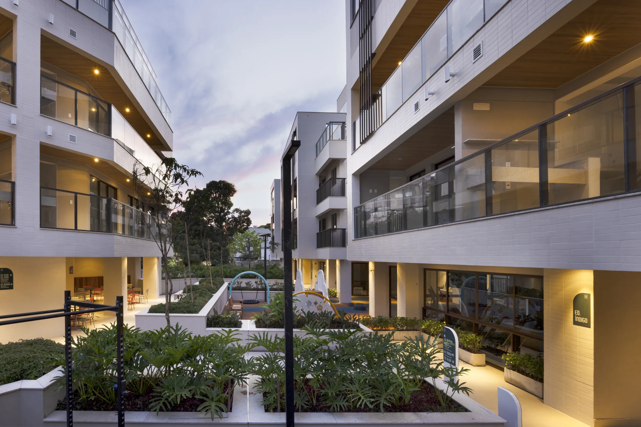 A contraposição de estímulos provocada por essas tonalidades representa, assim como o branco nas fachadas, o equilíbrio que buscamos em todo o projeto, e também em nosso dia-a-dia.