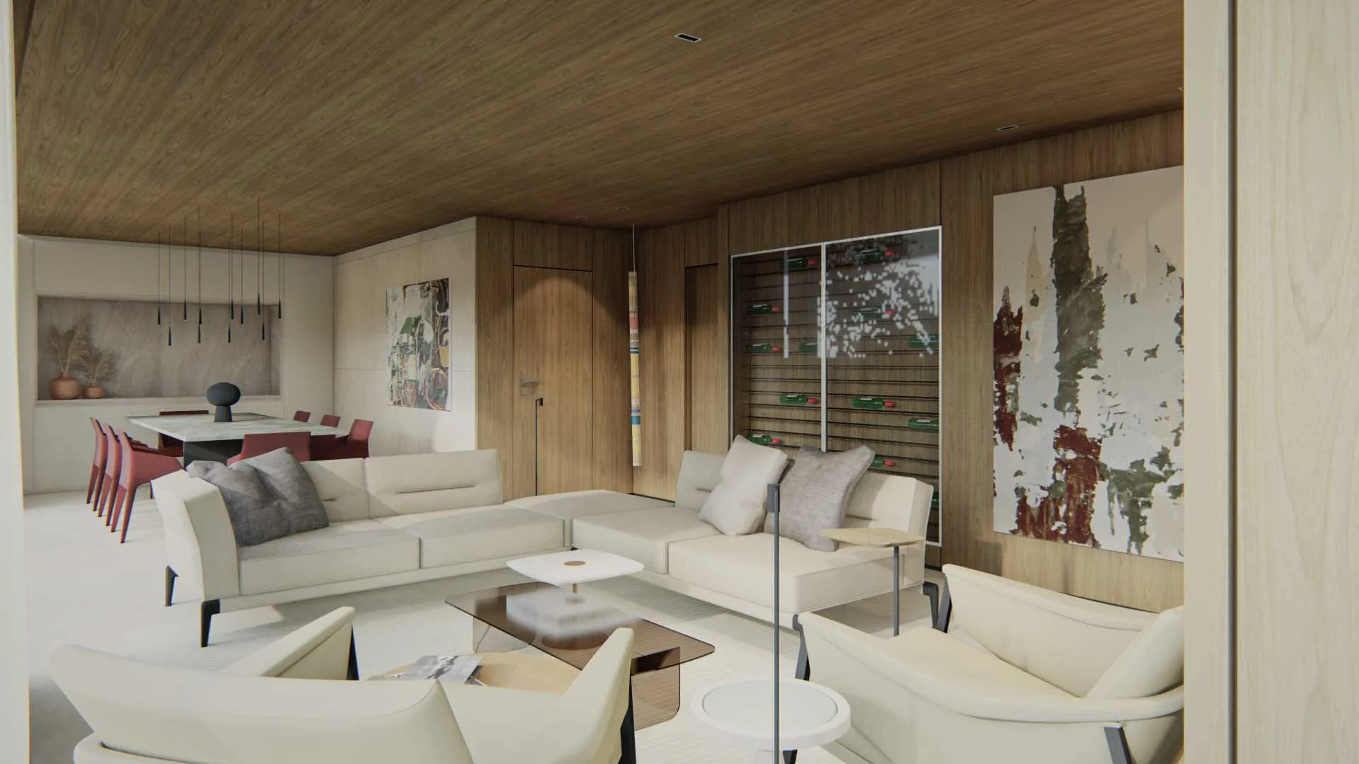 No primeiro pavimento, a sala se abre por completo para o terraço, que conta com área gourmet e piscina com vista para um dos principais cartões postais do Rio. Com um layout longitudinal, o ambiente divide-se em três ocupações: sala de jantar, estar e home theater. Em uma gradação de intimismo, todos os estares são abraçados por texturas de madeira e tons claros, usando da necessidade de manutenção de um shaft de instalações que corre para o segundo andar como um divisor entre as salas de jantar e estar e o home theater, mais recluso, camuflando a divisão com uso de marcenaria.